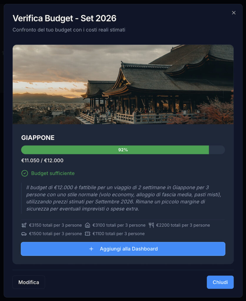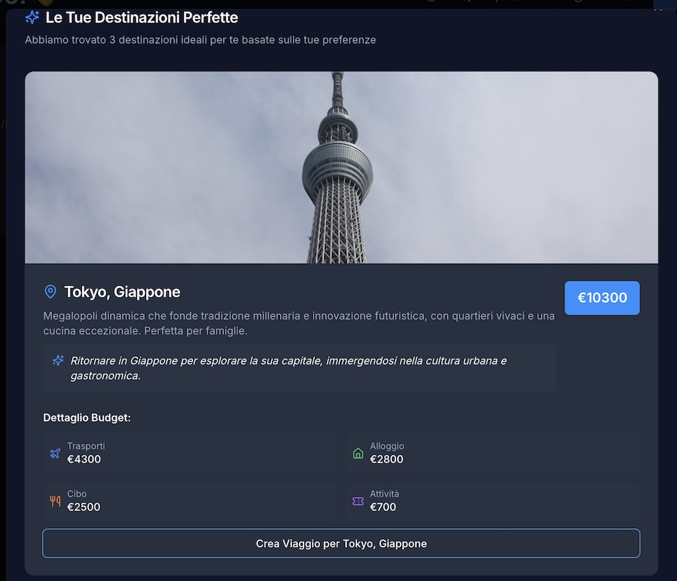 Risultato: GateAway ti suggerisce 3 destinazioni affini alle tue richieste con motivazioni specifiche per ogni destinazione e con budget realistico. Puoi anche scegliere di accettare un viaggio, aggiungerlo alla dashboard e lasciare che l’app ti faccia un breakdown dei costi dividi per tipologia.